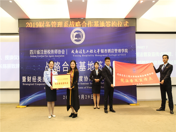 行业协会与高校合作是国家创新体系的重要组成部分,仪式上,杨源波副会长与张智勇院长作为双方战略合作伙伴代表分别致辞,均表示双方战略合作签订是协会与学院在应用型人才培养模式合作的进一步探索,双方将共同组织校企文化交流,教学、科研合作,教师挂职锻炼、建立学生实习实践教学基地等。随后学院院长张智勇代表学院与四川省注册税务师协会会长张炜进行了现场签约,互授“教学合作基地”牌匾。同时成都市郫都区税务局副局长陈丽为学院财务管理系授予“税法普及宣传点”牌匾和旗帜,并表示,郫都区税务局与我院建立战略性合作关系,是“税务宣传进校园”活动迈出的重要一步,在新时代发展的方向和主题中,有利于培养纳税意识,加强税法教育和宣传,助力人才培养和转型发展,营造社会良好氛围。